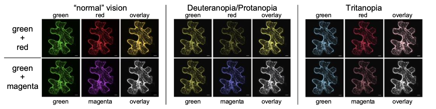 图片中的颜色应当差异明显且视觉效果良好。期刊都会要求考虑到色觉障碍人士,因而要求避免使用诸如红色与绿色这样的颜色组合作为对比(改为使用洋红色与绿色),尤其是在荧光显微照片中。